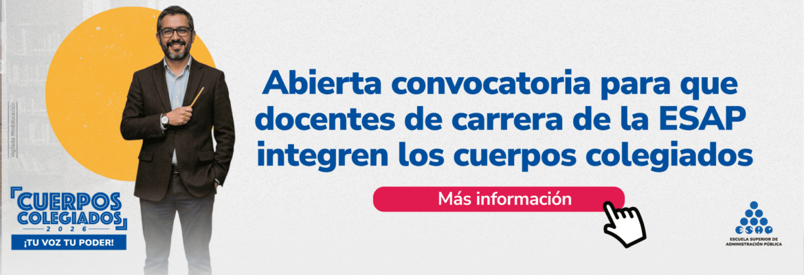 La Escuela Superior de Administración Pública (ESAP) abrió la convocatoria para que docentes de carrera de la sede central y de las direcciones territoriales participen en la elección de sus representantes en los diferentes cuerpos colegiados institucionales, espacios fundamentales para la orientación académica, el fortalecimiento de la investigación y la toma de decisiones estratégicas dentro de la institución.