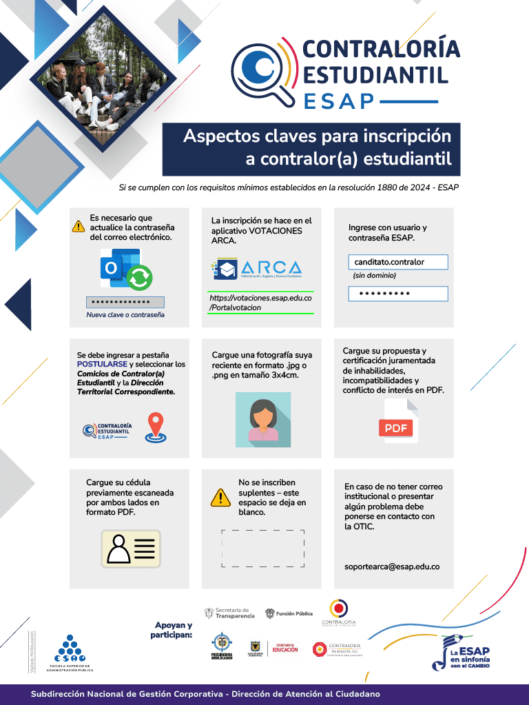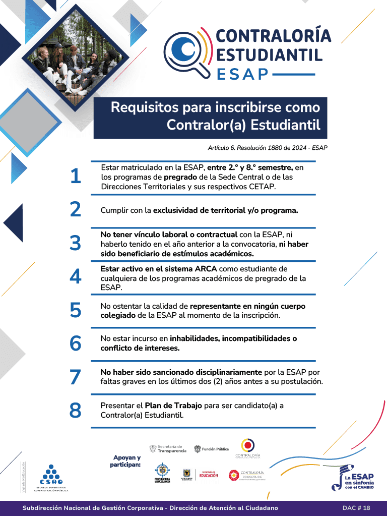 La resolución No 1880 del 13 de septiembre de 2024, convoca a las elecciones de los(as) Contralores(as) Estudiantiles de la ESAP.