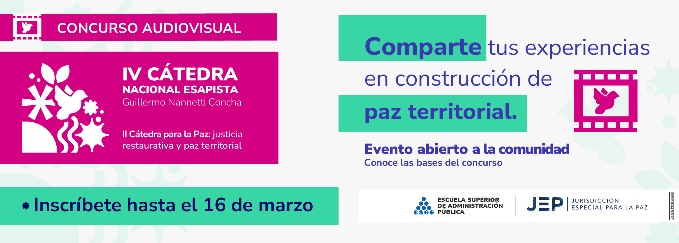En el marco de la Cátedra Nacional Esapista: II Cátedra para la Paz: Justicia Restaurativa y paz territorial, presentamos este concurso audiovisual que busca visibilizar aquellas historias y experiencias de construcción de paz desarrolladas en los diferentes territorios del país.