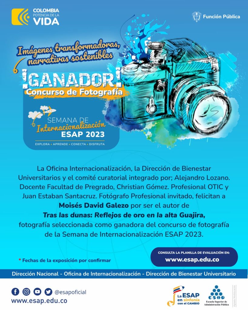 La Oficina de Internacionalización, con el apoyo la Dirección de Bienestar Universitario de la Escuela Superior de Administración Pública – ESAP invitan a los estudiantes de los programas de pregrado y posgrado y a los egresados a postularse al Concurso de fotografía “Imágenes transformadoras, narrativas sostenibles” de la Semana de Internacionalización ESAP 2023.