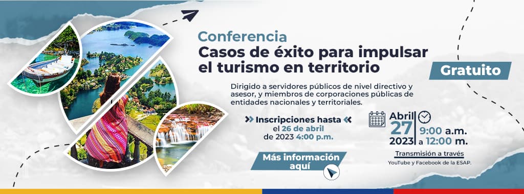 Abril 2023: La Escuela de Alto Gobierno de la ESAP invita a los servidores públicos de nivel directivo y asesor, y a los miembros de corporaciones públicas, a participar de la conferencia virtual “Casos de éxito para impulsar el turismo en territorio”.