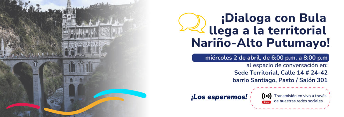 El próximo jueves 2 de abril a las 10:00 a.m., el profesor Jorge Iván Bula Escobar, director nacional, abrirá el espacio de conversación “Dialoga Con Bula” en la territorial de Nariño – Alto Putumayo.