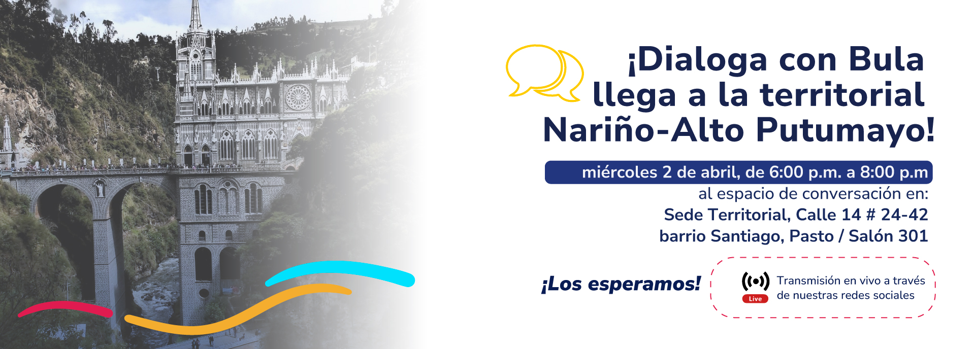 El próximo jueves 2 de abril a las 10:00 a.m., el profesor Jorge Iván Bula Escobar, director nacional, abrirá el espacio de conversación “Dialoga Con Bula” en la territorial de Nariño – Alto Putumayo.