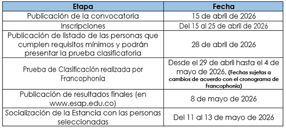 De acuerdo con las funciones establecidas para la Oficina de Internacionalización en el decreto 164 de 2021 y en cumplimiento de la línea estratégica “Comunidad Científica Global”, así como la apuesta de adquirir un nivel superior en una lengua extranjera para los estudiantes, la Escuela Superior de Administración Pública – ESAP, a través de la Oficina de Internacionalización, invita a los estudiantes de los programas de pregrado en Administración Pública, Administración Pública Territorial y estudiantes de Posgrado a participar en la convocatoria “BIENVENUE 2026” para ser beneficiario de una de las veinticinco (25) estancias lingüísticas a desarrollarse en Niza-Francia del 13 de junio al 12 de julio de 2026 en alianza con FRANCOPHONIA.
