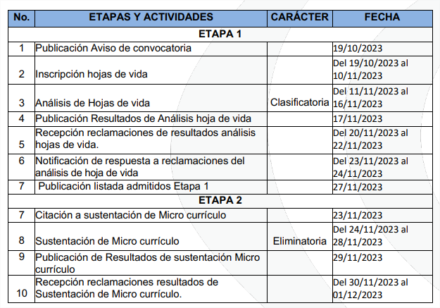 - Presentar con su inscripción, la propuesta de Micro currículo para una o máximo dos asignaturas para las cuales se haga la postulación.