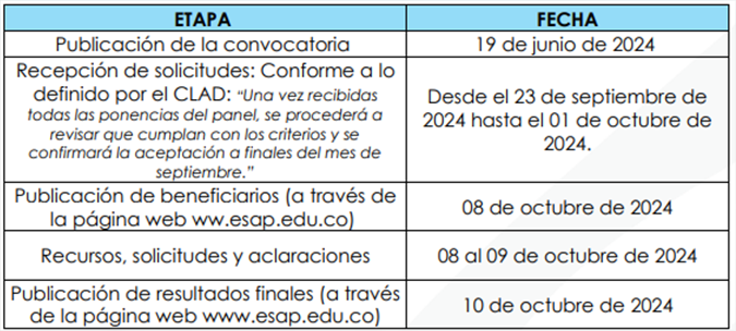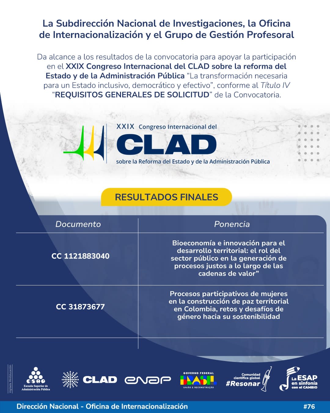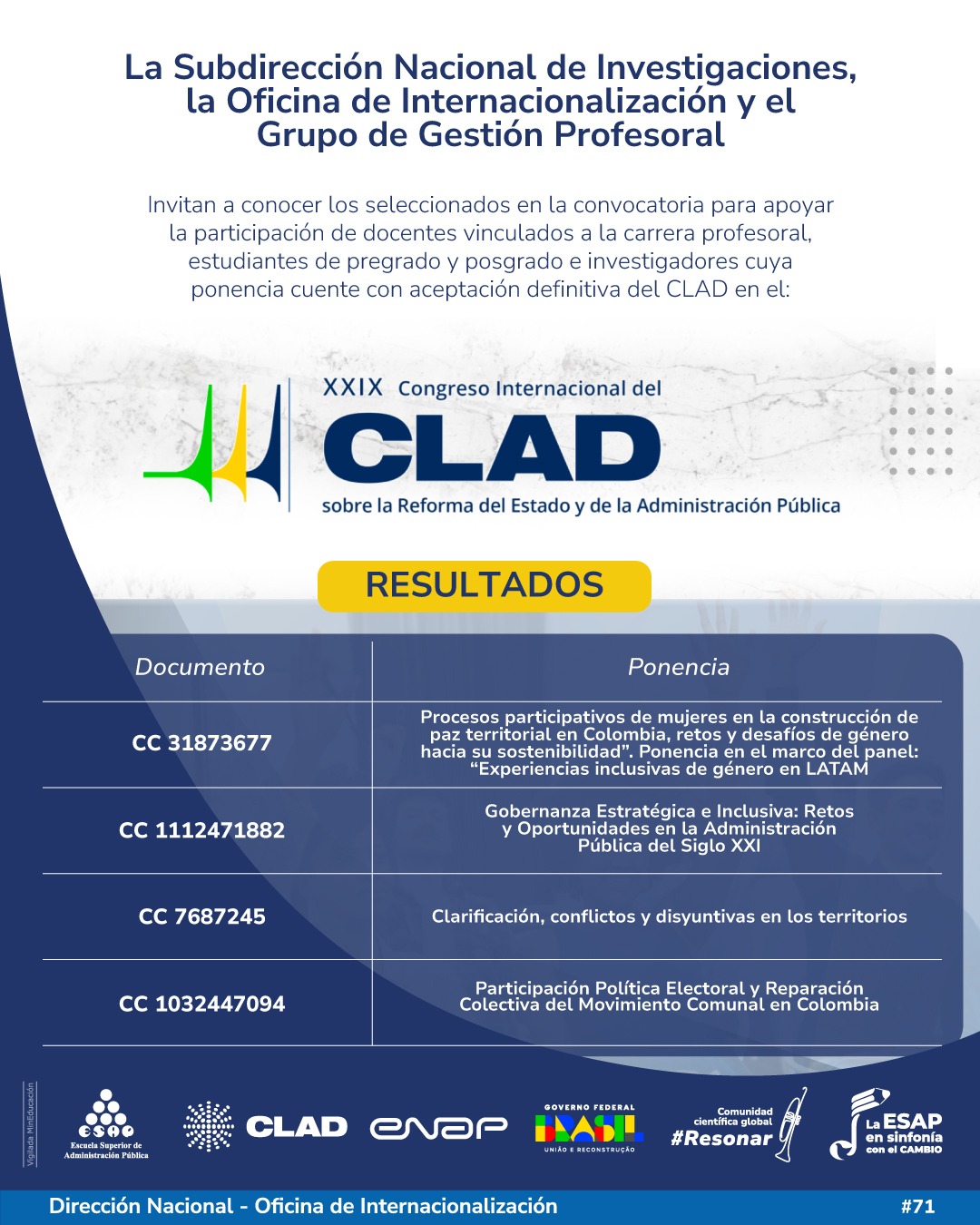 La Subdirección Nacional de Investigaciones, la Oficina de Internacionalización y el Grupo de Gestión Profesoral invitan a postularse en la convocatoria para apoyar la participación de docentes vinculados a la carrera profesoral, estudiantes de pregrado y posgrado e investigadores cuya ponencia cuente con aceptación definitiva del CLAD.