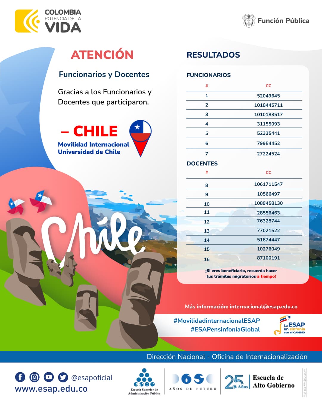 La Oficina De Internacionalización De La Escuela Superior Da Administración Pública – ESAP invita a 7 funcionarios públicos de la escuela y 9 docentes incluyendo profesores de no carrera, todos a nivel nacional para ser beneficiarios de una movilidad académica internacional en el marco del Memorando de Entendimiento suscrito entre la ESAP y la Universidad de Chile.