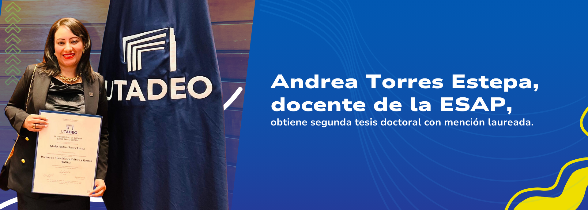 La Escuela Superior de Administración Pública (ESAP) felicita y celebra el importante logro académico de la profesora de carrera, Andrea Torres Estepa, quien ha obtenido su segunda tesis doctoral en Modelado en Política y Gestión Pública, por la Universidad Jorge Tadeo Lozano.