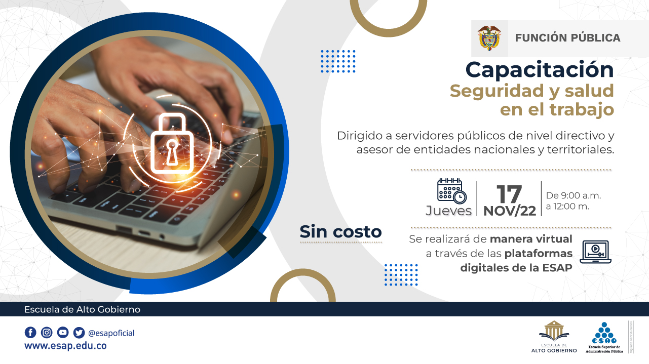 Noviembre de 2022: Con el fin de compartir experiencias cotidianas que permitan estimular el desarrollo de aptitudes y habilidades orientadas al talento humano, la Escuela de Alto Gobierno de la ESAP habilita las inscripciones para la capacitación en talento humano: Seguridad y salud en el trabajo.