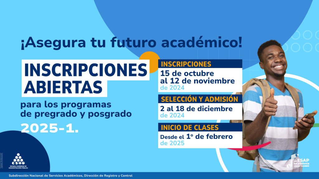 Fusagasugá, 16 de octubre de 2024. (Comunicaciones ESAP – Territorial Cundinamarca). Desde el 15 de octubre y hasta el 12 de noviembre de 2024, están abiertas las inscripciones para los programas de formación en pregrado y posgrado de la Escuela Superior de Administración Pública Territorial Cundinamarca, para la vigencia académica 2025-1.