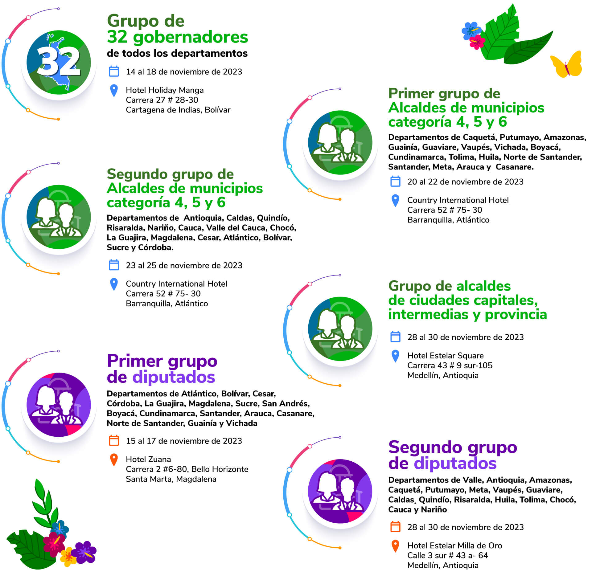 Las clases presenciales del curso se llevarán a cabo en diversas ciudades del país a partir del 14 de noviembre. Como punto culminante de este proceso de formación, se celebrará un encuentro nacional del 13 al 15 de diciembre de 2023 en el Centro de Convenciones Valle del Pacífico ubicado en Santiago de Cali, Valle del Cauca.