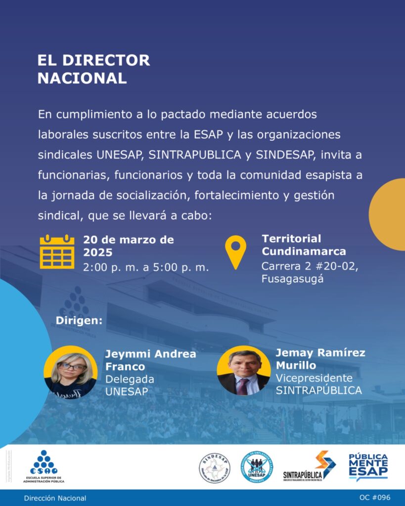 | 3 | Jornada de socialización y fortalecimiento a la gestión sindical UNESAP y SINTRAPÚBLICA | Fusagasuga | 2025/03/20 | ||||