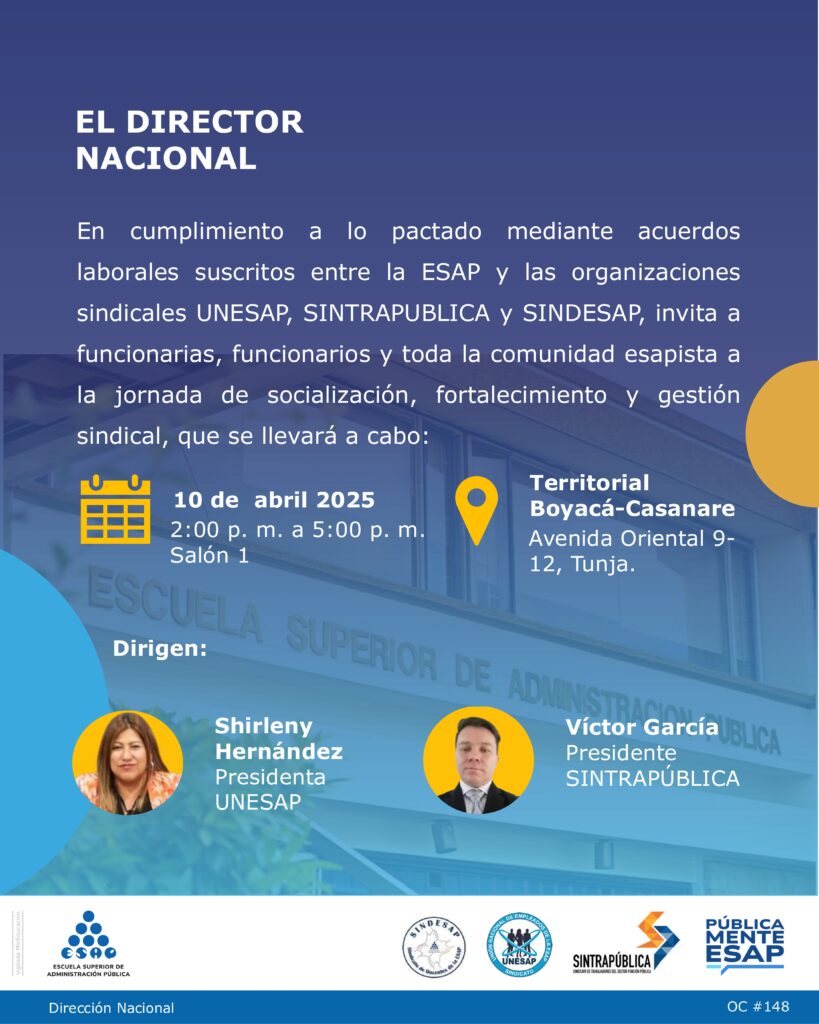 | 5 | Jornada de socialización y fortalecimiento a la gestión sindical UNESAP y SINTRAPÚBLICA | Tunja | 2025/04/10 | ||||