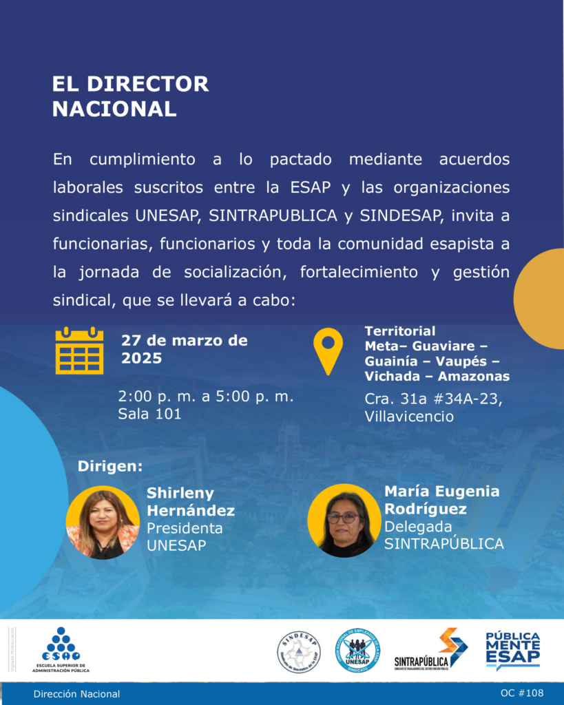 | 4 | Jornada de socialización y fortalecimiento a la gestión sindical UNESAP y SINTRAPÚBLICA | Villavicencio | 2025/03/27 | ||||