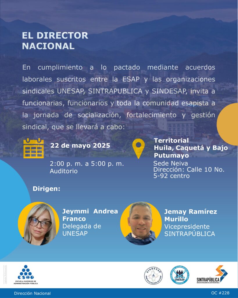 | 8 | Jornada de socialización y fortalecimiento a la gestión sindical UNESAP y SINTRAPÚBLICA | Neiva | 2025/05/22 | ||||