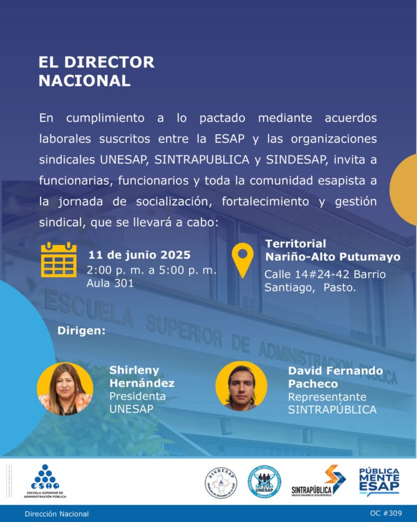 | 9 | Jornada de socialización y fortalecimiento a la gestión sindical UNESAP y SINTRAPÚBLICA | Pasto | 2025/06/11 | ||||