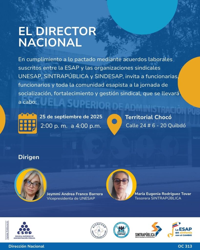 | 13 | Jornada de socialización y fortalecimiento a la gestión sindical UNESAP y SINTRAPÚBLICA | Quibdó | 2025/09/25 | ||||