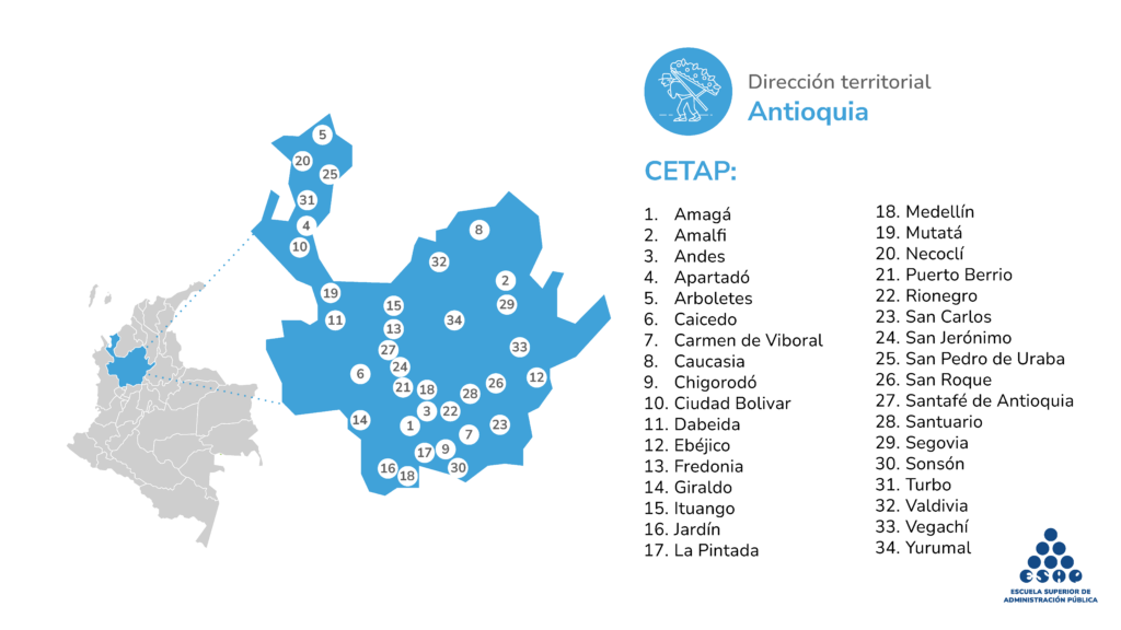 Andes, Apartadó, Arboletes, Carmen de Viboral, Chigorodó, Ciudad Bolívar, Dabeiba, Ebéjico, Giraldo, Ituango, Jardín, Jericó, La Pintada, Medellín, Mutatá, Necoclí, Puerto Berrio, Sabanalarga, San Carlos, San Jerónimo, San Pedro de Urabá, Titiribí, Turbo, Vegachí, Yarumal.