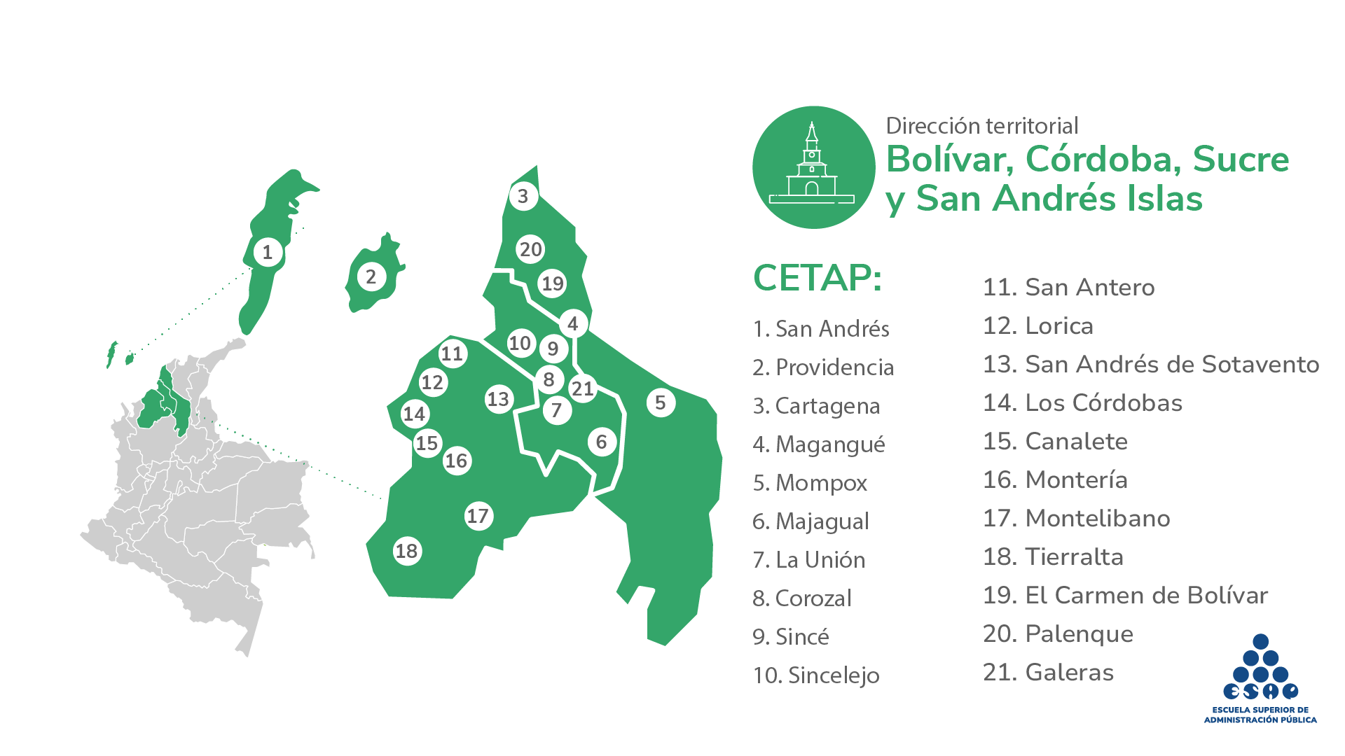Canalete, Cartagena, Cerete, El Carmen de Bolivar, Isla de Providencia, La Unión – Sucre, Lorica, Los córdobas, Magangue, Majagual, Mompos, Montelíbano, Monteria, San Andres Islas, San Andres de Sotavento-Resguardo Indigena , San Antero, San Basilio del Palenque, Since, Galeras, Sincelejo, Tierra Alta.