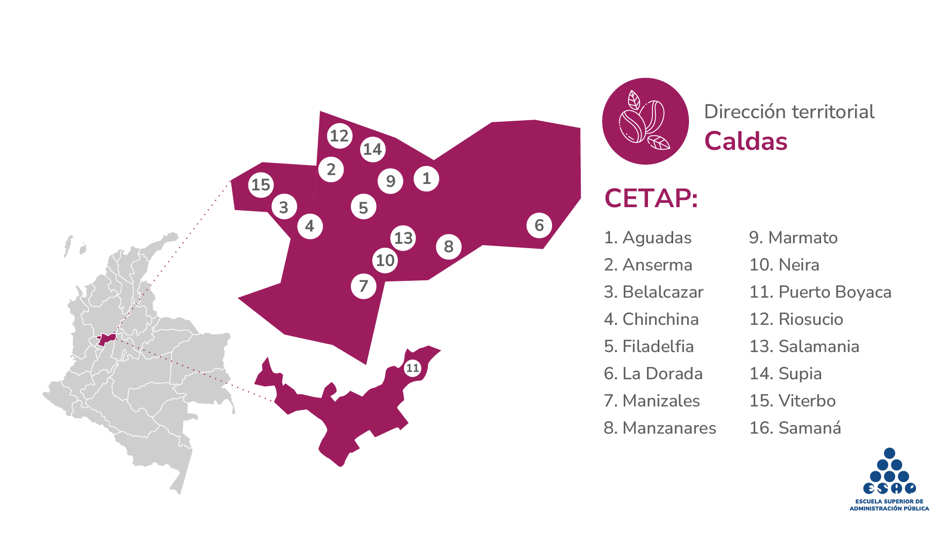 | Chinchiná | Emao – Calle 8 con carrera 8 esquina | María Emilia Quintero | 3218429556 | mariae.quintero@esap.edu.co |