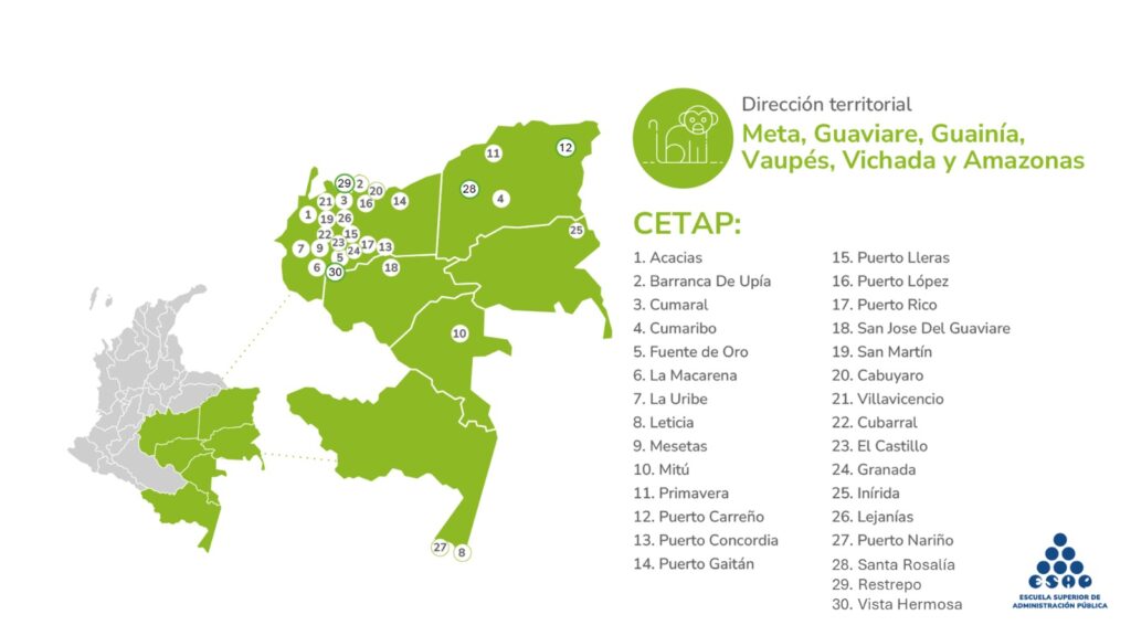 Villavicencio, Acacías, San Martín de los Llanos, Puerto Lleras, Puerto Rico, Puerto Concordia, La Macarena, Cumaral, Barranca de Upía, La Uribe, Mesetas, Puerto López, Puerto Gaitán, Fuente de oro, Leticia, Mitú, San José del Guaviare, La Primavera, Puerto Carreño, Cumaribo, Cabuyaro, Cubarral, El Castillo, Granada, Inírida, Lejanías, Puerto Nariño.