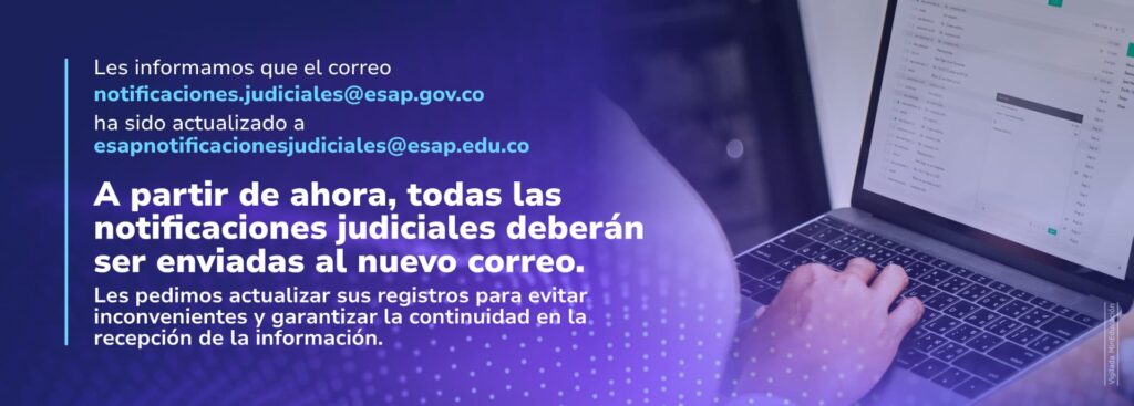 La ESAP ha dispuesto este correo electrónico para que los despachos judiciales cuenten con un medio de comunicación más ágil que permita dar celeridad a los trámites en que es parte: esapnotificacionesjudiciales@esap.edu.co