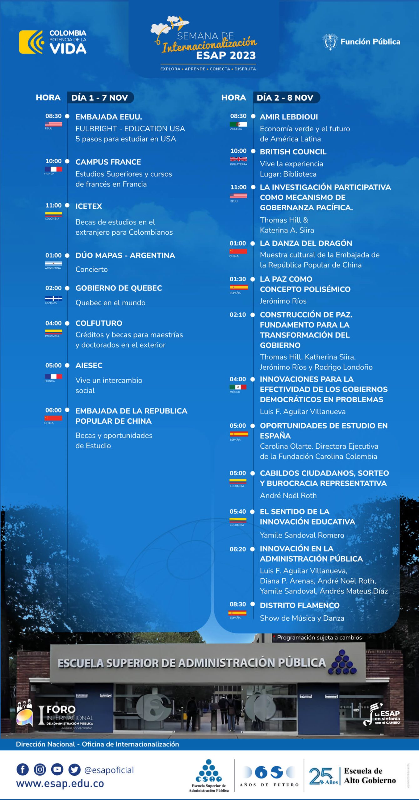 Charlas informativas, conferencias, asesorías personalizadas, una exhibición permanente de oportunidades en el extranjero, becas, arte, cultura, el I FORO INTERNACIONAL DE ADMINISTRACIÓN PÚBLICA ESAP 2023 y mucho más te espera en la Semana de Internacionalización ESAP 2023.