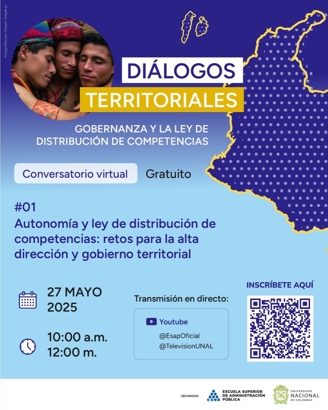 Transmisión por: @esapoficial Organizan: Escuela Superior de Administración Pública Universidad Nacional de Colombia Fotografía: por Freepik freepik.es