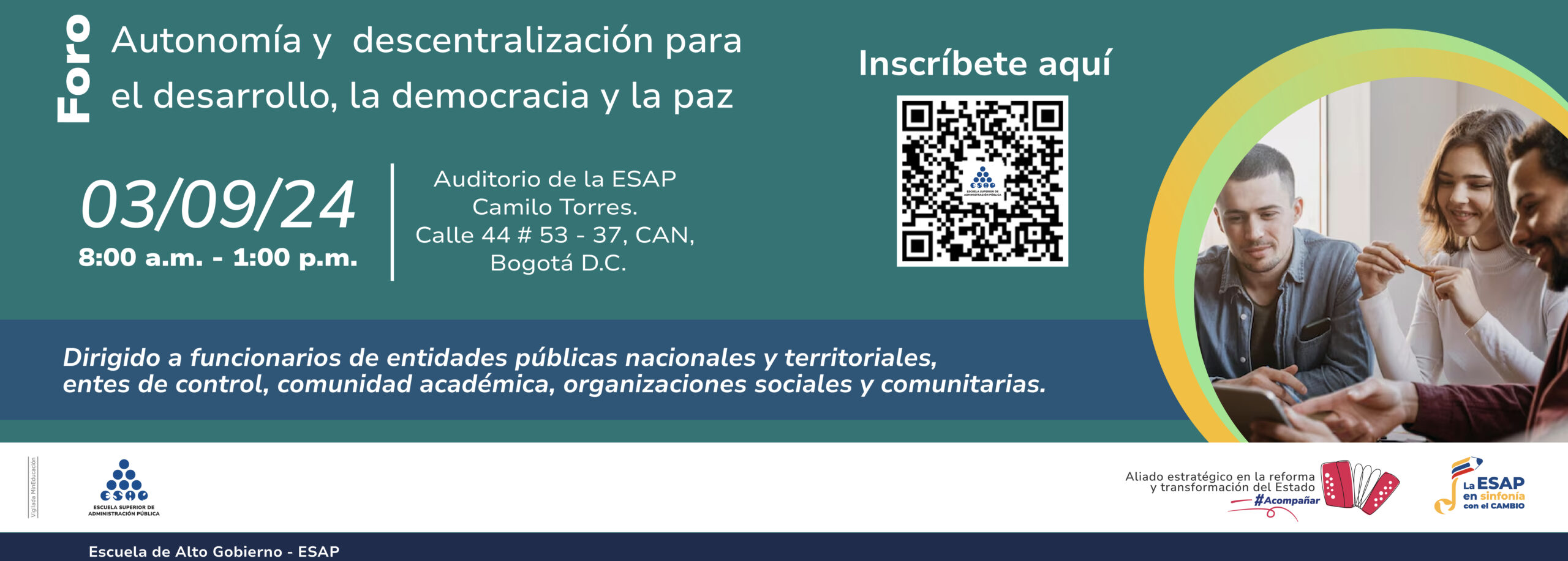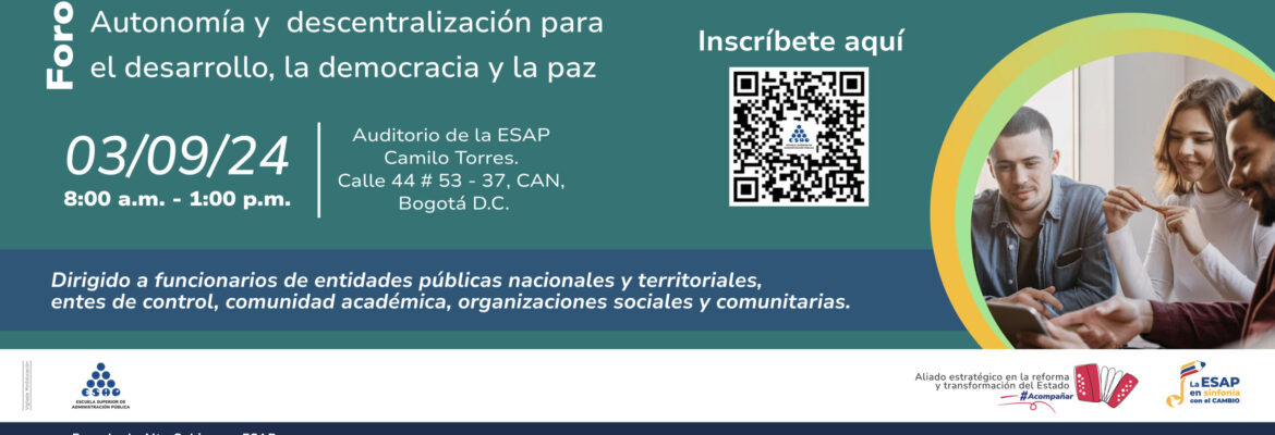 Con el objetivo de crear espacios de reflexión y debate académico sobre los gobiernos territoriales y el ejercicio efectivo de la descentralización y la autonomía para el desarrollo, la democracia y la paz en Colombia, la Escuela de Alto Gobierno – ESAP, los invita a participar el próximo 3 de septiembre de 2024 en el Foro: Autonomía y descentralización para el desarrollo, la democracia y la paz, ”Homenaje a Mauricio Betancourt” un espacio para reflexionar sobre el futuro de nuestros gobiernos territoriales.