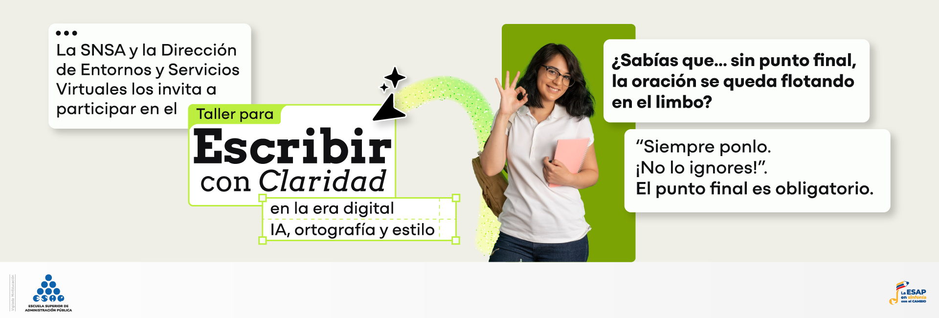 La Escuela Superior de Administración Pública (ESAP), a través de la Dirección de Entornos y Servicios Virtuales, se complace en invitar a toda la comunidad educativa a participar en el taller práctico de escritura clara y correcta que tiene como objetivo principal brindar herramientas necesarias para mejorar sus habilidades en redacción, permitiéndoles comunicarse de manera efectiva y precisa en cualquier contexto.