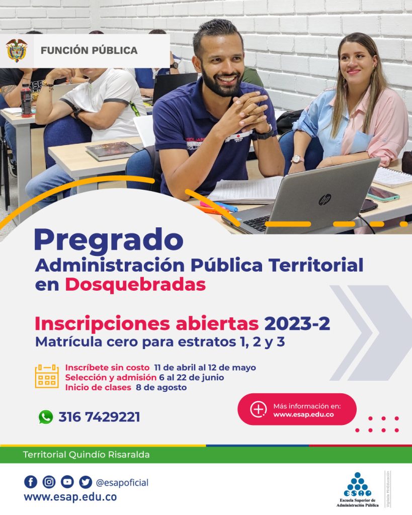 Dosquebradas, 17 de abril de 2023. (Comunicaciones ESAP – Territorial Quindío-Risaralda). La Escuela Superior de Administración Pública – ESAP Territorial Quindío – Risaralda tiene abiertas sus inscripciones para la oferta académica de pregrado y posgrado. Las inscripciones para el segundo semestre del 2023 estarán abiertas hasta el próximo 12 de mayo de 2023 con la exención del pago total de inscripción para pregrado.