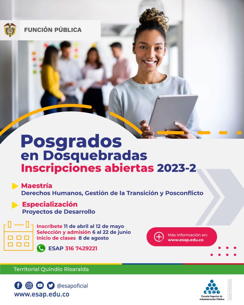 Los profesionales interesados en especializaciones o maestrías podrán inscribirse en la modalidad distancia tradicional de la ESAP Territorial Quindío – Risaralda en el municipio de Dosquebradas. La oferta para este segundo semestre del 2023 es: Especialización en Proyectos de Desarrollo y Maestría en Derechos Humanos, Gestión de la Transición y Posconflicto; con descuentos especiales y becas.