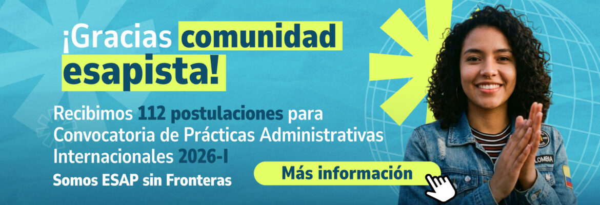 Con 112 postulaciones suscritas por aspirantes de las más diversas latitudes del país y de la misma Bogotá, la Escuela Superior de Administración Pública (ESAP), a través de la Oficina de Internacionalización, cerró inscripciones a la cuarta edición de la ‘Convocatoria de Prácticas Administrativas Internacionales 2026-I-ESAP Sin Fronteras’, abierta para estudiantes de los programas de Administración Pública (AP) y Administración Pública Territorial (APT).
