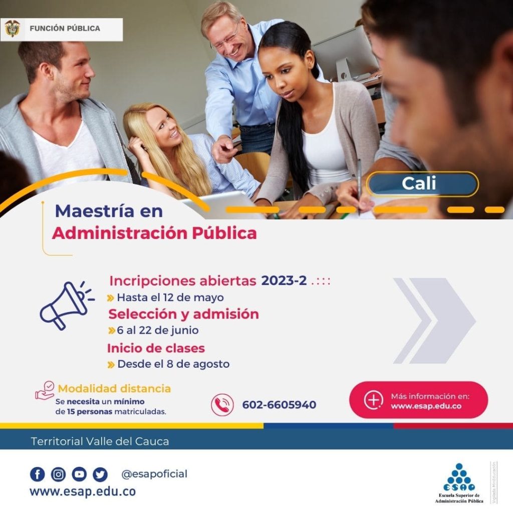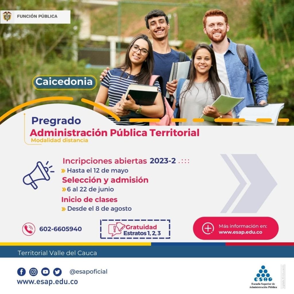 Cali, 17 de marzo de 2023. (Comunicaciones ESAP-Territorial Valle). La Escuela Superior de Administración Pública -ESAP inició el período de inscripciones para sus programas en pregrado y posgrado, el cual se extenderá hasta el próximo 12 de mayo de 2023. En cuanto a la oferta académica en el departamento del Valle del Cauca, este semestre los lugares de desarrollo habilitados para el pregrado en Administración Pública Territorial son Cali y Caicedonia.