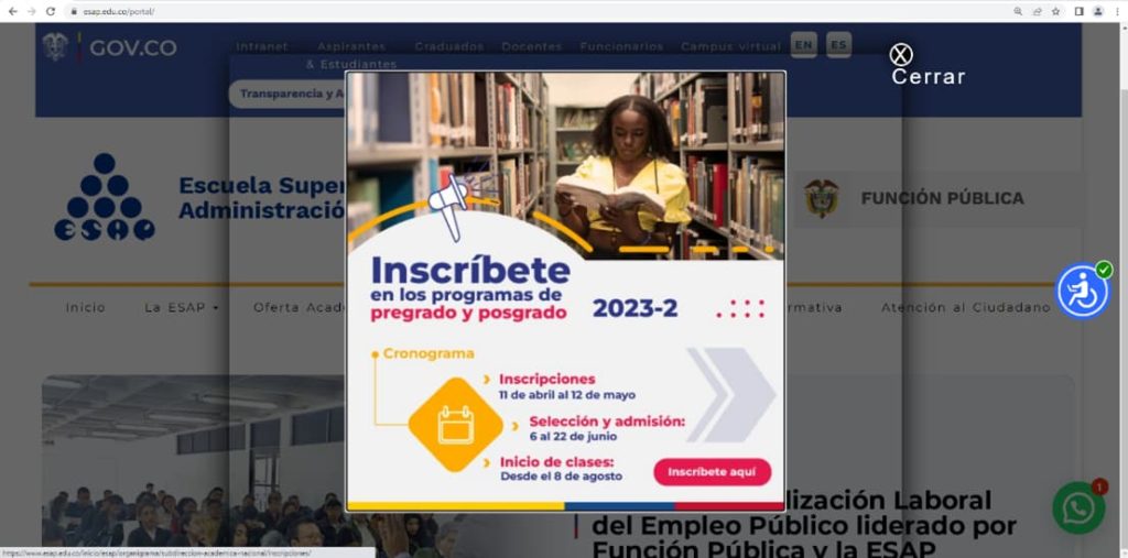 Las personas interesadas en inscribirse en alguno de nuestros programas deben acceder a la página web www.esap.edu.co y seguir la ruta propuesta en la ventana emergente.