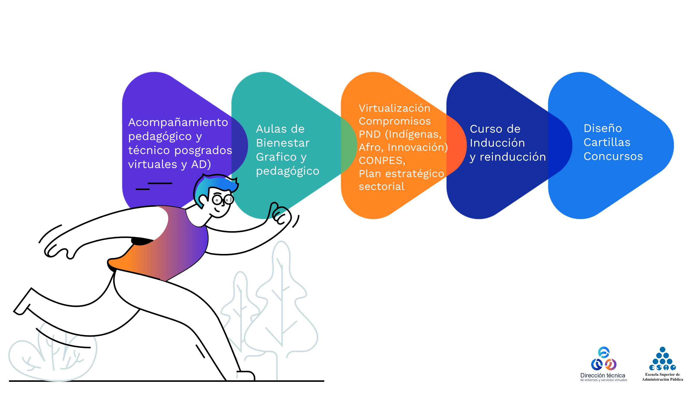 Los seminarios, talleres, cursos y diplomados son totalmente gratis y certificados, además, están relacionados con temáticas como: Derechos Humanos y Liderazgo para la Paz, Control Social a la Gestión Pública, Participación de las Mujeres en la Acción Pública, Resolución de Conflictos, Proyectos de Desarrollo II, Supervisión e Interventoría Contractual, Contratación Pública Electrónica y Compras Públicas Inteligentes, Sistema y Cuadro de Clasificación Documental, Gestión Integral del Servicio al Ciudadano y Gestión del Riesgo de Desastres, Negociación Colectiva, Enfoque Diferencial Indígena, Gramática, Evaluación de Políticas Públicas; entre otros.