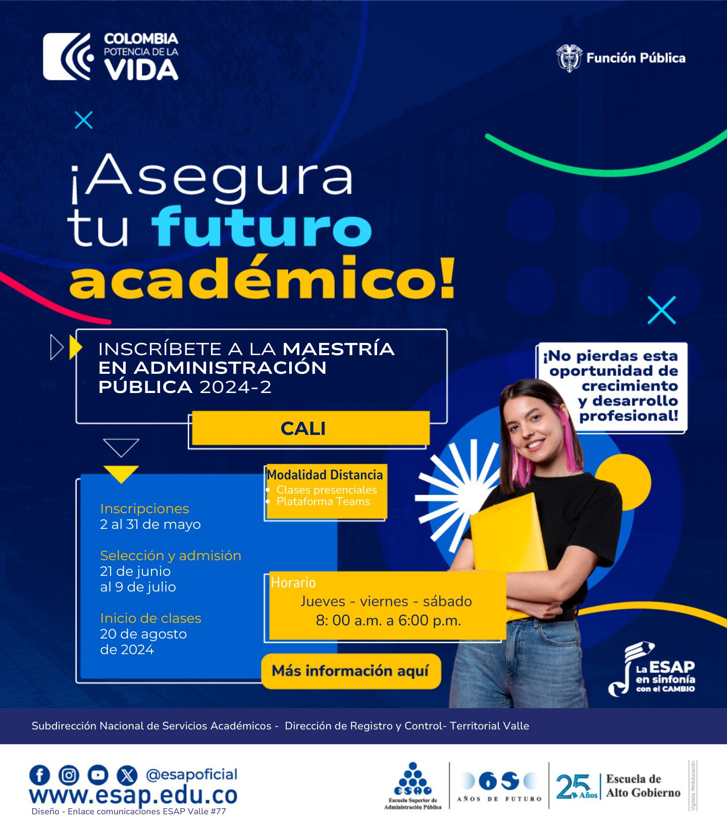 Santiago de Cali, 6 de mayo (Comunicaciones ESAP). Con más de medio siglo de presencia en el departamento, la Escuela Superior de Administración Pública – ESAP continua su proceso de consolidación entre los vallecaucanos. Para el periodo académico 2024- 2, las subregiones del centro y sur se beneficiarán con la apertura de inscripciones en los programas de pregrado y posgrado, las cuales se extenderán hasta el 31 de mayo.