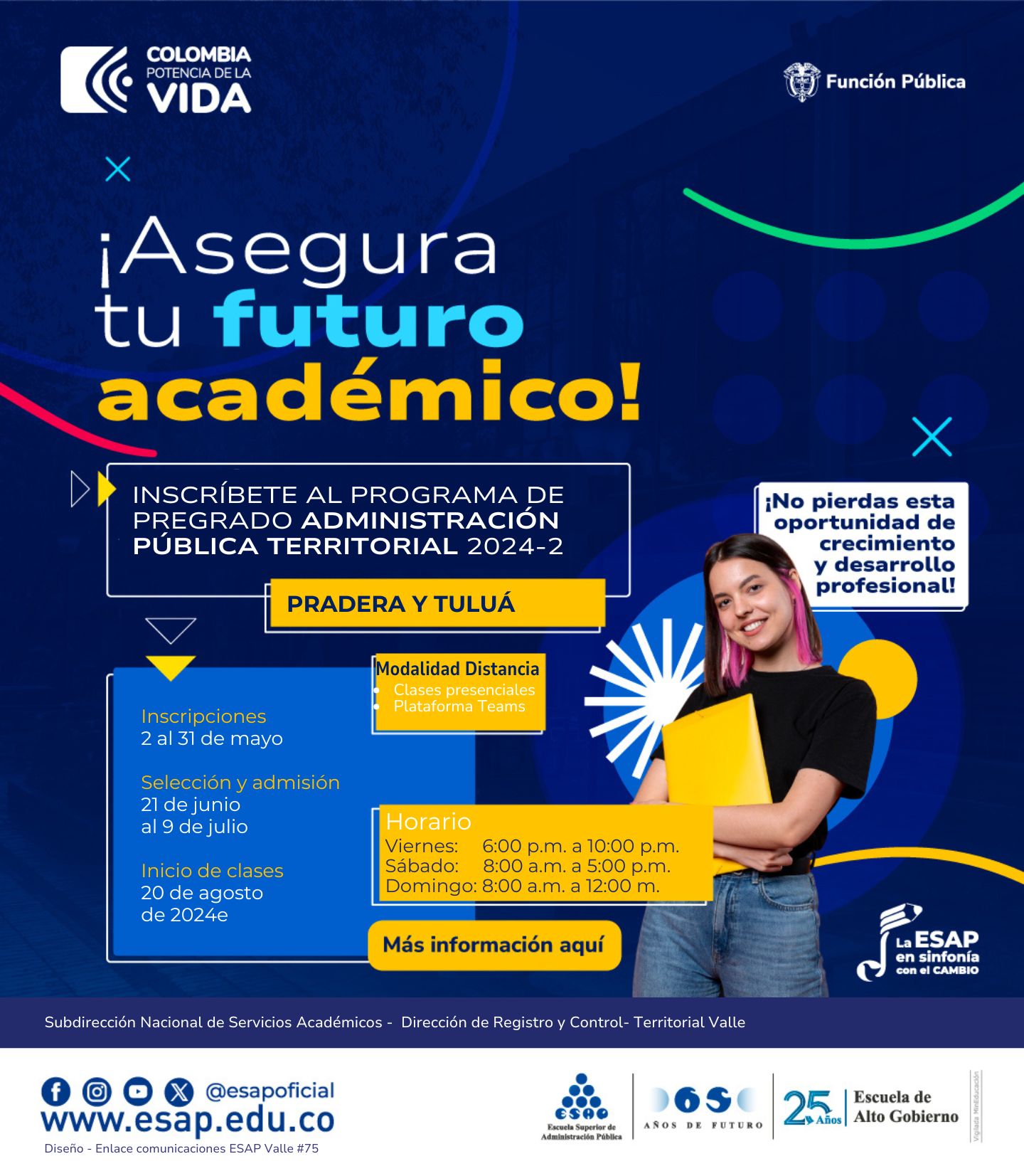 En los municipios de Pradera y Tuluá se ofertará el programa en Administración Pública Territorial. Es importante informar a sus habitantes sobre la gratuidad de este pregrado en los estratos 1, 2 y 3, con la condicionalidad que quienes aspiren a este beneficio, no tengan previamente un título profesional. La modalidad es a distancia, por lo tanto, se desarrollarán las clases de manera presencial, y también, a través de la Plataforma Teams. Los días en los que se realizarán las clases son viernes, sábados y domingos.