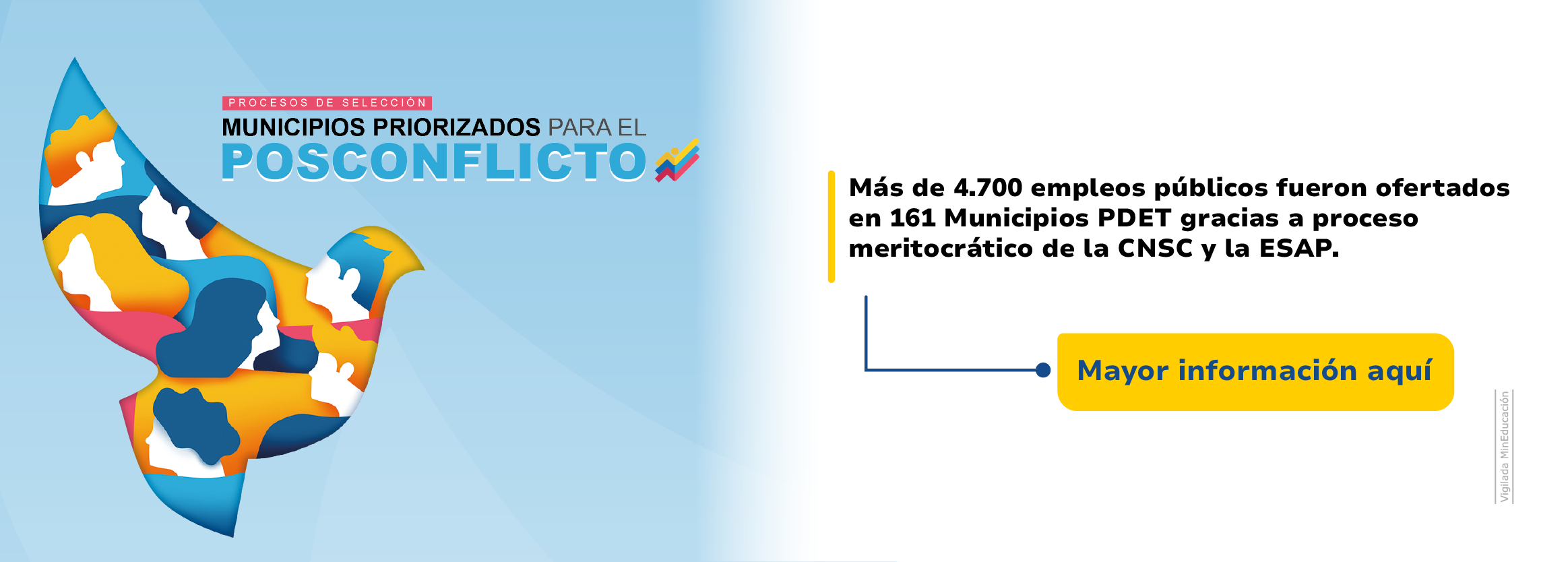 Bogotá D.C., 30 de agosto de 2023. Con el evento “Servicio civil en los municipios priorizados para el posconflicto: lecciones de paz, Estado y sociedad”, la Comisión Nacional del Servicio Civil – CNSC y la Escuela Superior de Administración Pública – ESAP, socializarán los resultados del proceso de selección Municipios Priorizados para el Posconflicto PDET.