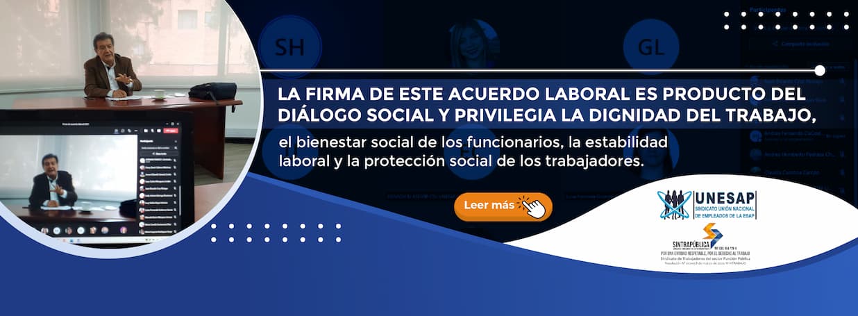 Bogotá D. C, 4 de junio de 2021. En el marco del fortalecimiento de la Escuela Superior de Administración Pública (ESAP), el cual ha venido adelantando desde hace dos años, el Director Nacional de la entidad, Pedro Medellín Torres y en línea con el proceso de reestructuración institucional que se encuentra en marcha, la ESAP en cabeza del director, firmó el día de hoy un acuerdo colectivo con los representantes del Sindicato de Trabajadores del Sector Función Pública (SINTRAPÚBLICA) y la Unión Nacional de Empleados de la ESAP (UNESAP).