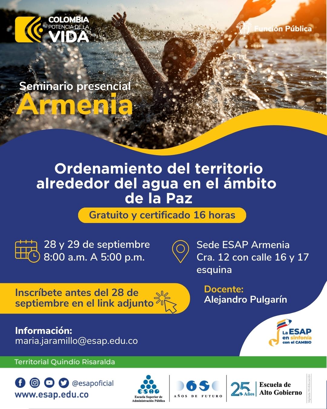 - La ESAP territorial Quindío-Risaralda lidera el seminario ‘Ordenamiento del Territorio Alrededor del Agua en el Ámbito de la Paz’, que se realizará en la ciudad de Armenia.