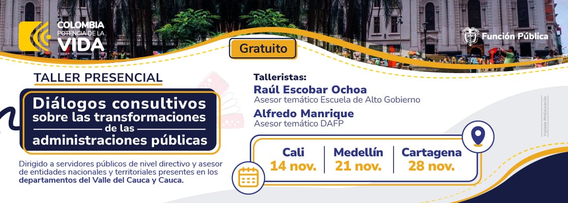 Bogotá D.C., 9 de noviembre de 2023. COMUNICACIONES ESAP. La Escuela de Alto Gobierno de la Escuela Superior de Administración Pública (ESAP) invita al taller “Diálogos consultivos sobre las transformaciones de las administraciones públicas” a realizarse el 14 noviembre en Cali; el 21 de noviembre en Medellín; y el 28 de noviembre en Cartagena.