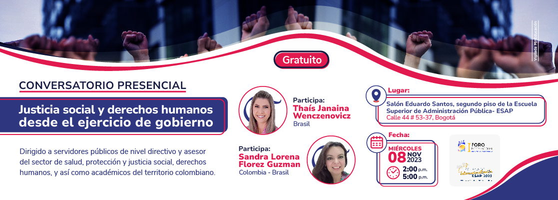 Bogotá D.C., octubre de 2023. COMUNICACIONES ESAP. La Escuela de Alto Gobierno de la Escuela Superior de Administración Pública (ESAP) invita a los servidores públicos de nivel directivo y asesor del sector de salud pública, protección social, derechos humanos y justicia social, funcionarios de la Secretaría de Salud Distrital, funcionarios de la Defensoría Pública, representantes de sociedades de usuarios y profesionales de la salud, académicos, universidades, integrantes de las comisiones de Senado y Cámara, representantes del cuerpo diplomático de Brasil. También, al personal docente y directivo de la ESAP, a participar del conversatorio “Justicia social y derechos humanos desde el ejercicio de gobierno”.