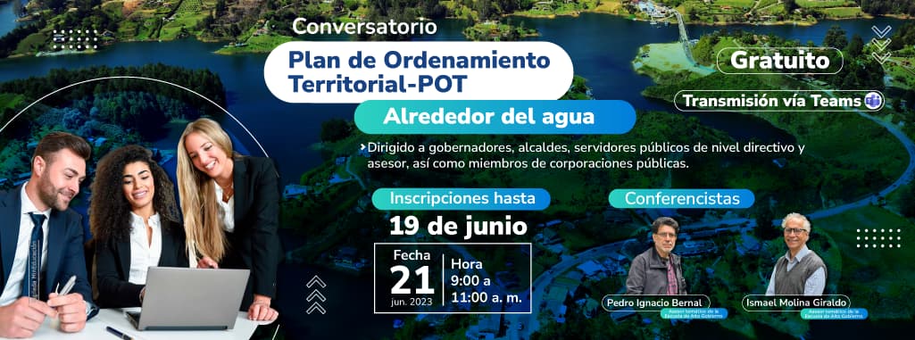 Bogotá, junio de 2023. (Comunicaciones – ESAP). Con el objetivo de fomentar un debate sobre las acciones clave en la alta gerencia que pueden enmarcarse en un esfuerzo colectivo de ordenamiento del territorio, en línea con las bases establecidas en el Plan Nacional de Desarrollo, la Escuela de Alto Gobierno de la ESAP abre las inscripciones para la conferencia virtual “Plan de Ordenamiento Territorial alrededor del agua”.