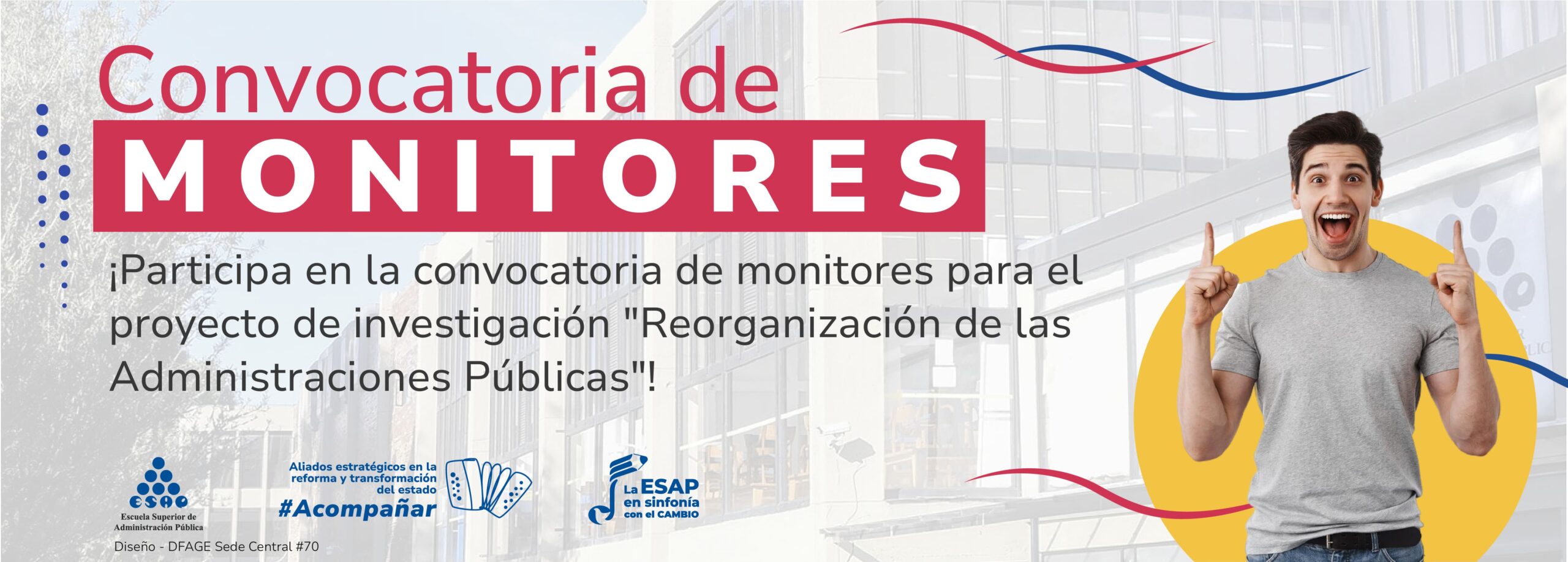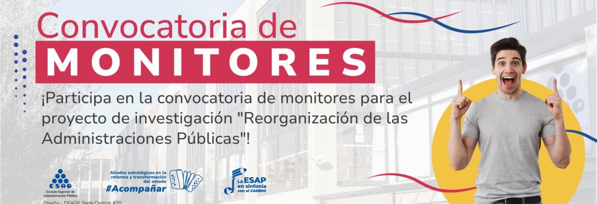 • El objeto al cual se vinculará el monitor es: Apoyar y participar en el desarrollo del proyecto de investigación denominado “Reorganización de las Administraciones Públicas” que se desarrollará en coordinación con el Departamento Administrativo de la Función Pública – DAFP.