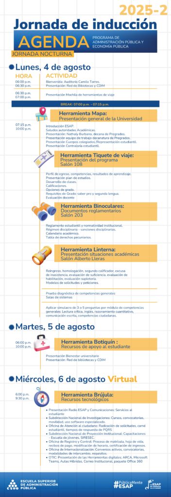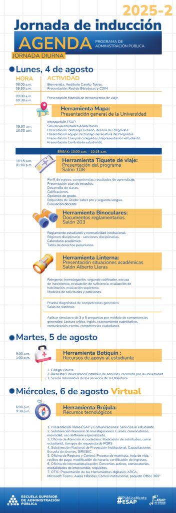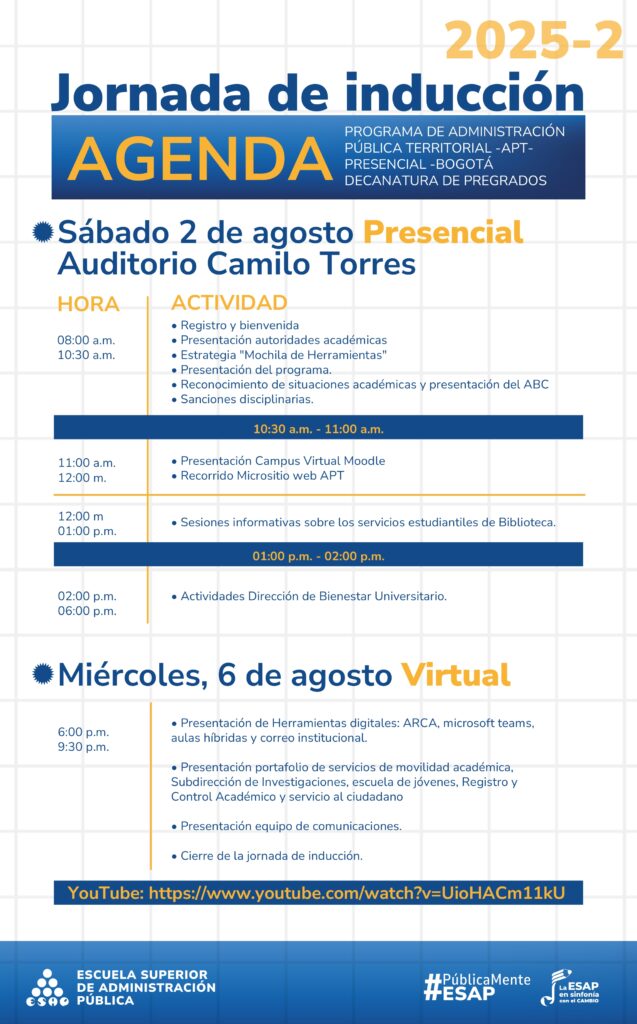 La Escuela Superior de Administración Pública (ESAP) te invita a ti, a tus nuevos compañeros y compañeras y a todos quienes empiezan su formación de pregrado en los tres programas académicos, Administración Pública Territorial (APT), Administración Pública (AP) y Economía Pública (EP), a participar en las Jornadas de Inducción 2025-2, espacios diseñados para darte la bienvenida, brindarte información clave y acompañarte en el inicio de tu formación como servidor público.