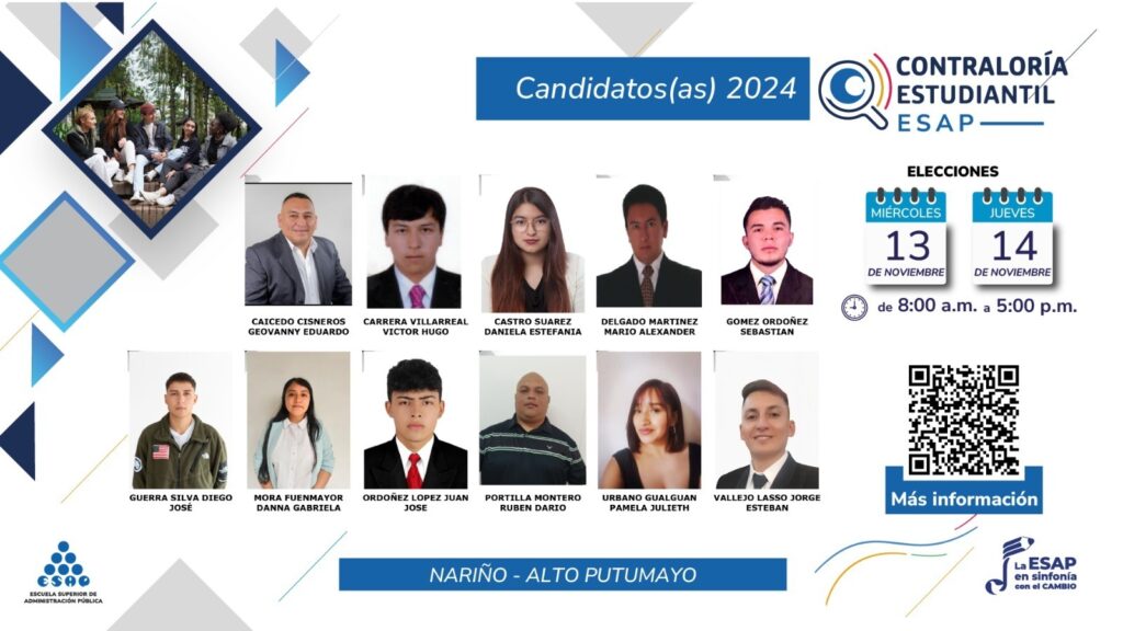 Nariño, 27 de noviembre 2024 (Comunicaciones ESAP). En un hecho histórico para la educación superior, por primera vez se eligieron los contralores estudiantiles en el país y la primicia es que la Escuela Superior de Administración Pública (ESAP) fue la entidad universitaria pionera en la elección de esta importante figura para la comunidad académica, en especial, la Territorial Nariño, Alto Putumayo, la cual, obtuvo el mayor número de votos entre las 16 direcciones territoriales y la Sede Central en Bogotá.