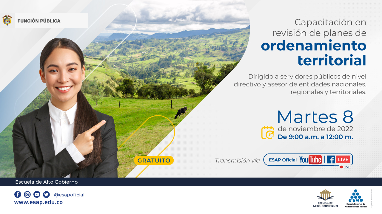 Noviembre de 2022: La Escuela de Alto Gobierno de la ESAP habilita las inscripciones para la capacitación virtual sobre la revisión de planes de ordenamiento territorial dirigida a gobernadores, alcaldes, concejales, ediles, directivos, miembros de asambleas departamentales, secretarios de despachos, jefes de oficina, asesores y demás cargos directivos de entidades nacionales y territoriales.